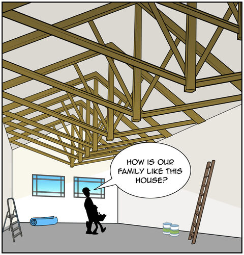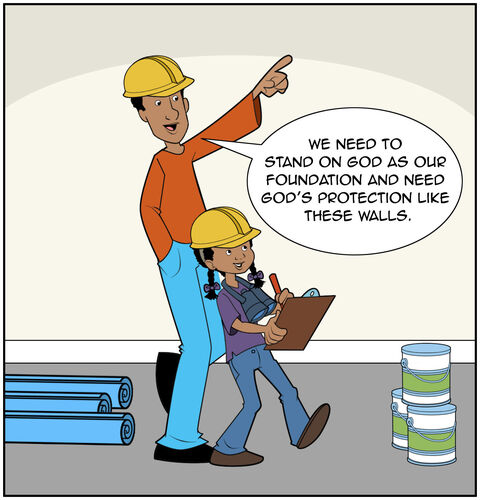 Walls hold up the house, and a roof protects it from the wind and the rain. God protects your family, and you and your parents can read about God’s everlasting faithful promises in his Word. Together, you can learn the importance of obeying God’s commands. By knowing what is right and wrong, you will be able to make choices that build yourself and others up.
