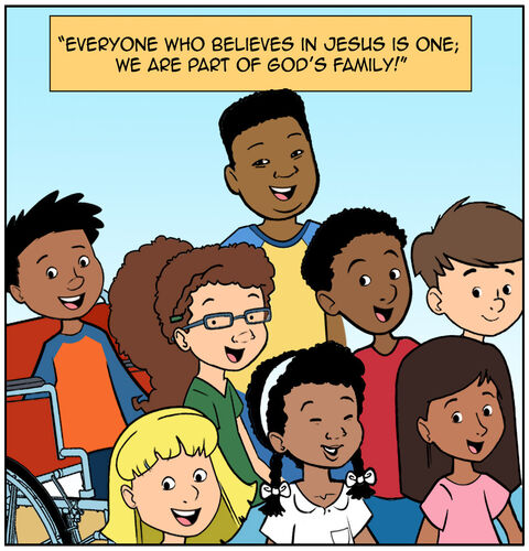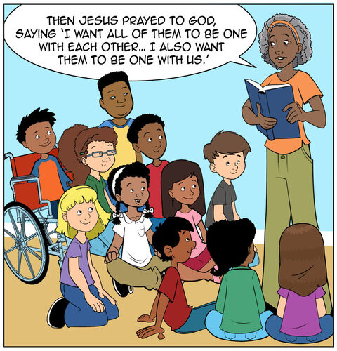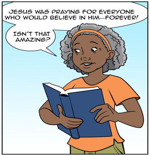 Jesus wasn’t just praying for the believers born in the next few years—or even the next thousand years. He was praying for everyone who would believe in him—forever! Isn’t that amazing? Jesus wants everyone who believes in him to be united in him. In other words, everyone who believes in Jesus is one; we are part of God’s family! God’s love becomes a part of us, and more people will learn about Jesus through the love we share. Because of Jesus, we can pray and talk to God about anything. Jesus is with God, and he can help us talk to God every day.