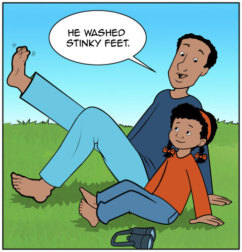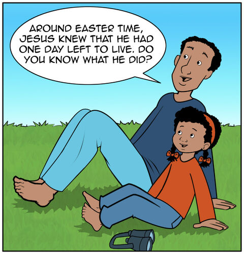 Jesus knew that he was going to die on the cross for the sins of the world. By dying on the cross, he would give everyone the chance to be in God’s family. But before that, he showed his love for his disciples by washing their feet. Back then, people didn’t have running water, and they couldn’t take showers every day. They wore sandals and walked on dirt roads where animals like donkeys and sheep also walked. Their feet probably smelled like a petting zoo. Jesus and his disciples were having dinner together. Jesus surprised everyone by getting up from the table, taking off his outer clothing, and wrapping a towel around his waist. This was how servants dressed in their time. He poured water into a large bowl and began washing his disciples’ feet, drying them with the towel he wore. His disciples didn’t understand what he was doing. Why would Jesus wash their stinky, smelly feet? That was a job for a servant, not for the Son of God, the Savior of the world!