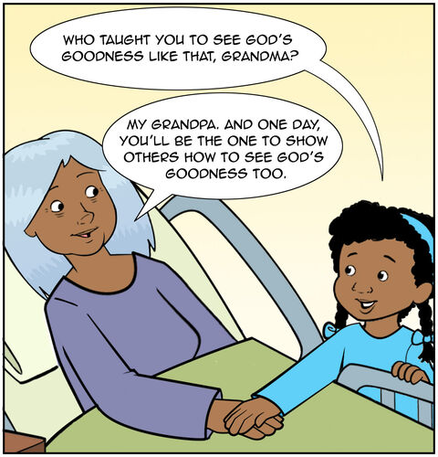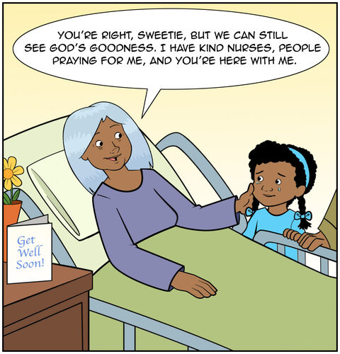 Grandma wiped Casey’s tears and agreed. “But we can still see God’s goodness,” she said. “I have kind nurses taking care of me, people praying for me, and you are here.”